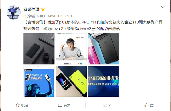 赛诺表示,增加了Plus版本的OPPO R11和性价比较高的金立S10两大系列产品持续热销。华为nova 2 Plus、荣耀6A、ivvi V3三款新品表现好。由此不难看出,这几款新机在市场中很受用户青睐,其中ivvi V3则是刚上市不久的一款产品。