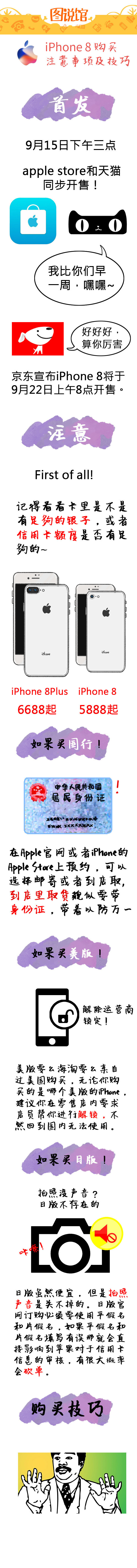 9月15日下午三点iphoness 8/8 Plus正式开售,大家都买到了吗?不过要说到购买苹果新品这件事,其实是有技巧可循的,并且需要get一些注意事项。首先,今天下午三点iphoness 8/8 Plus在Apple Store和天猫同时开售,而在国内电商平台,天猫是开售最早的一家。京东则将在9月22日上午8点开始这两款新机。当然,购买iphoness 8/8 Plus也有不少注意事项,比如信用卡额度啦,国行版和美版的区别等等,具体细节还请看一张图为你解答。