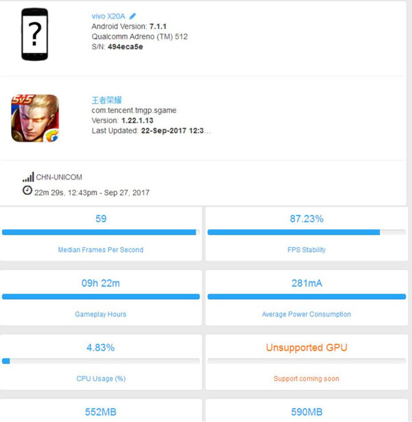 当然了,一些消费者始终认为上手体验会有主观意识参杂。这里通过GameBench后台简册一局完整的5V5对战(大约20分钟左右),全场的平均帧率为59帧,CPU的占用率也十分出色。