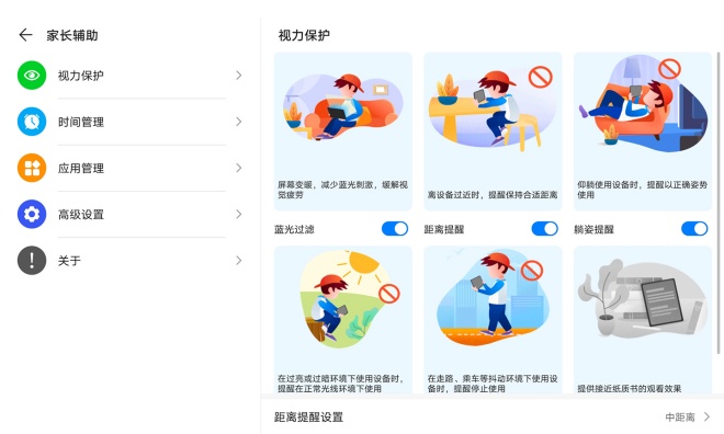 除了高标准过滤蓝光,多重智能护眼更实时关注孩子的坐姿、距离等是否合适。若是孩子躺着使用或者近距离使用,平板会智能提醒。此外,还会根据学习环境的光照条件智能判断,进行感光提醒,帮助孩子保持良好的用眼习惯。
