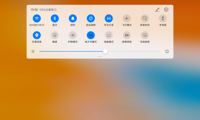 电子书模式设置方法很简单:从状态栏下滑出通知面板(下滑两次),点亮电子书模式。如果通知面板中找不到电子书模式开关,点击 图标,将其拖动到通知面板显示区域。