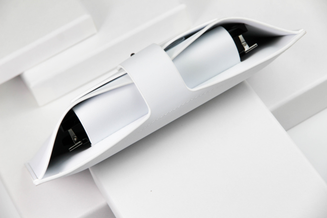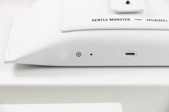 Eyewear智能眼镜的眼镜盒除了可以保护眼睛以外,还是一个具备无线充电功能的充电盒。使用方式有点类似HUAWEI FreeBuds 3真无线耳机,首次连接设备之后只要将眼镜取出眼镜盒就会自动连接设备,将眼镜放回眼镜盒自动断开连接进行充电。在眼镜盒的底部可以看到Type-C充电接口和蓝牙配对按钮以及指示灯。