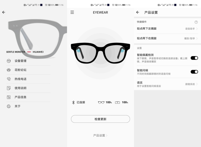 在手机上也可以下载配套的EYEWEAR APP,来对Eyewear眼镜进行个性化的功能设置,也可以使用智慧生活APP来进行绑定设置。Eyewear的左右镜腿都能实现触控敲击操作,也能像HUAWEI FreeBuds 3无线耳机那样智能识别佩戴情况。摘下眼镜就自动暂停音乐,3分钟内重新佩戴即可恢复播放。