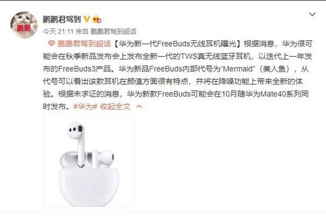 华为新品FreeBuds内部代号为“Mermaid”(美人鱼),从代号可以看出该款耳机在颜值方面很有特点,并将在降噪功能上带来全新的体验。推测,华为新款FreeBuds可能会在10月随华为Mate40系列同时发布。