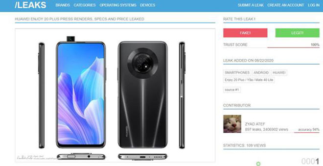 22日,Slashleaks 网站曝光了华为畅享 20 Plus 官方渲染图和这款手机的部分参数,如下图所示。