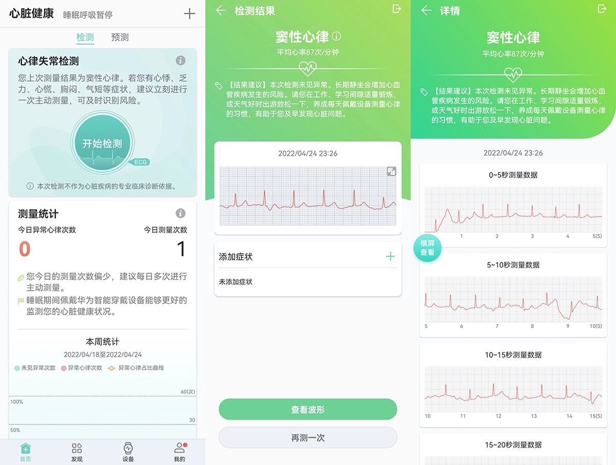 ECG功能对于我这种自媒体特别有用,毕竟经常熬夜撸稿、经常睡眠不足、工作强度经常超标,需要一位心脏健康管家随时监测身体状况。好在华为心电分析提示软件,早在2021年就已经获得了药品监督管理局二类医疗器械注册证,配合高性能心电传感器模组,支持单导联心电测量和实时分析,可提示成人窦性心律、房颤、室性早搏和房性早搏,并在手表上直接显示结果,在一定程度上能够让用户更好地了解自己的身体状况,及时发现身体的问题,为你我的健康保健护航。
