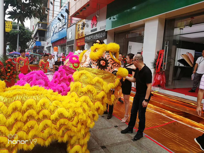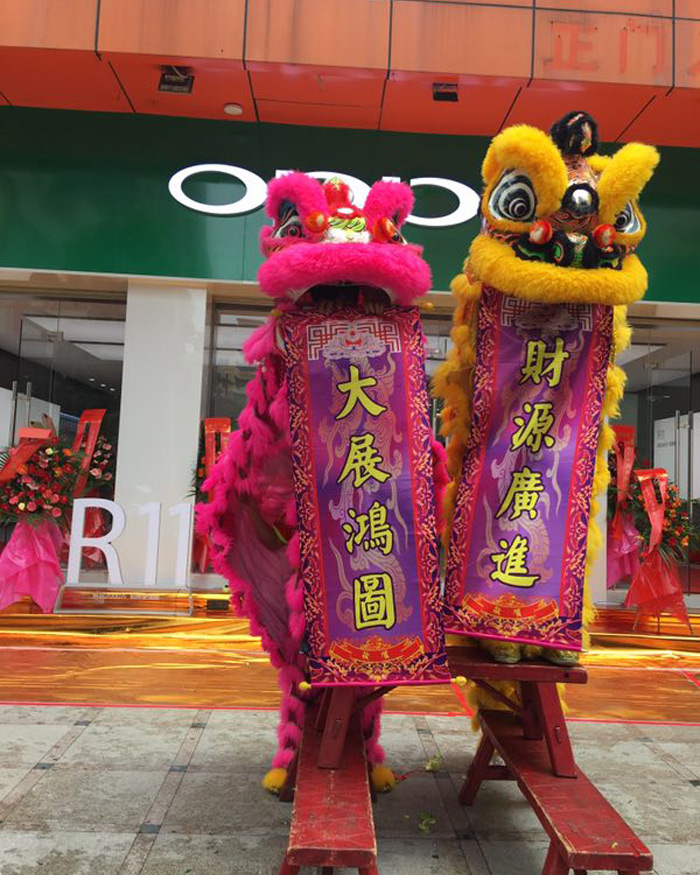 一点天庭,福星高照;二点眼睛,眼观六路;三点口利,笑口常开;四点铁角,顶天立地;五点耳朵,左右逢源;六点头尾,六六大顺。龙狮开光,祝虎门OPPO旗舰店六六大顺,大吉大利!