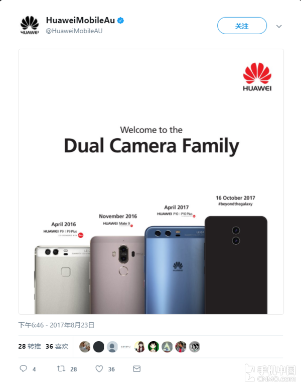 近日,华为澳大利亚公司公布了一张海报,该海报曝光了华为Mate 10的外观设计。从图中看出,华为Mate 10与前作Mate 9差不多,均为后置双摄设计。另外,该海报还指出了华为Mate 10的具体发布日期,看来今年10月中旬我们就能见到这款国产旗舰机的身影了。