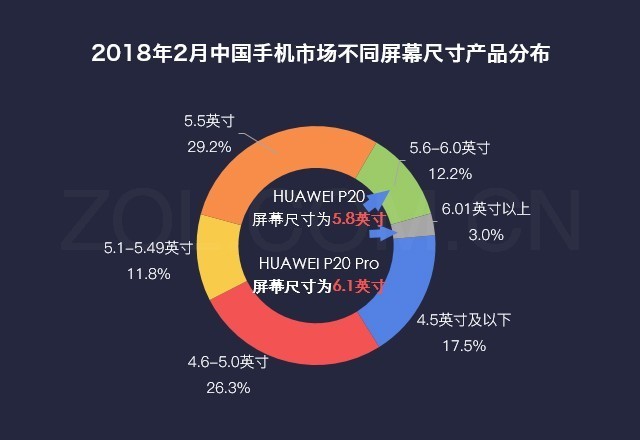 数说HUAWEI P20系:极光色三摄征服用户 2018年2月中国手机市场不同屏幕尺寸产品分布除了屏幕,极光渐变机身是华为P20系列的大亮点。“华为 P20 系列采用了更加协调的机身设计”——余承东发布会语。