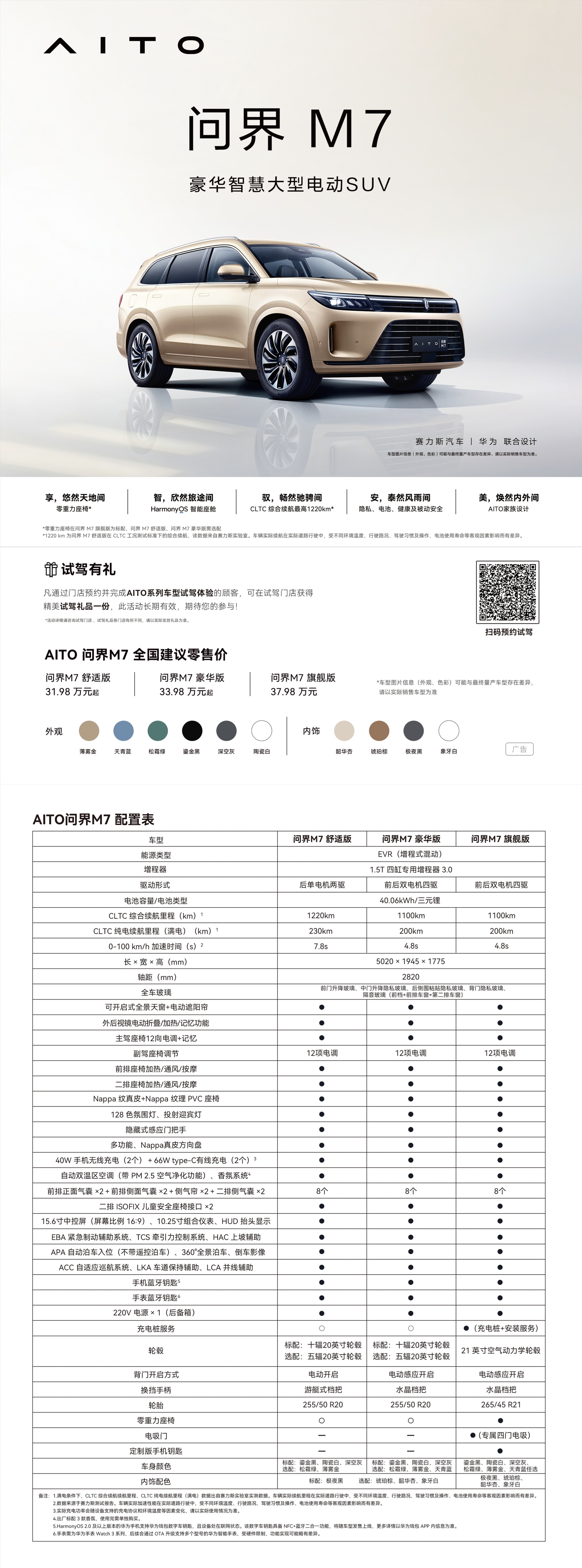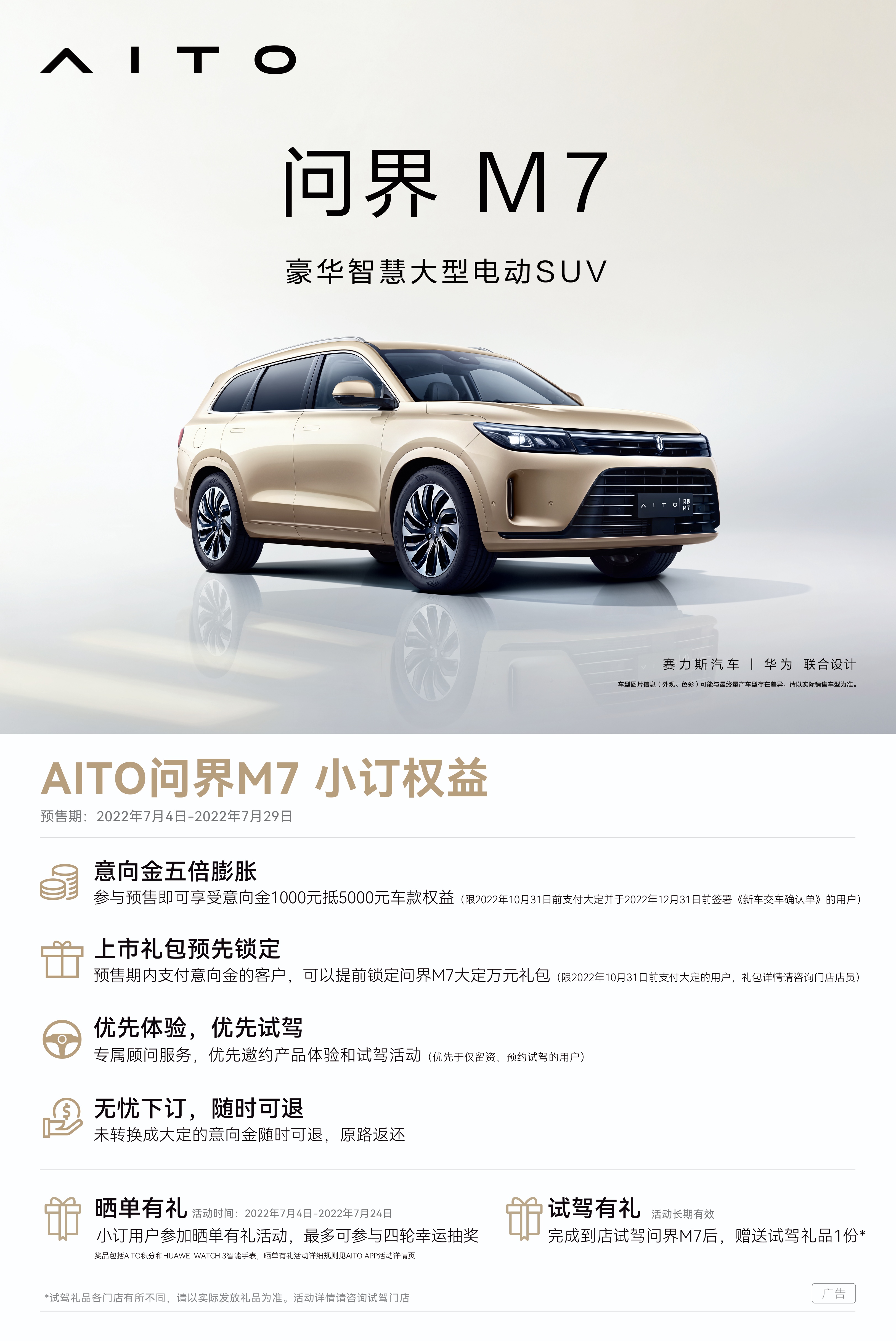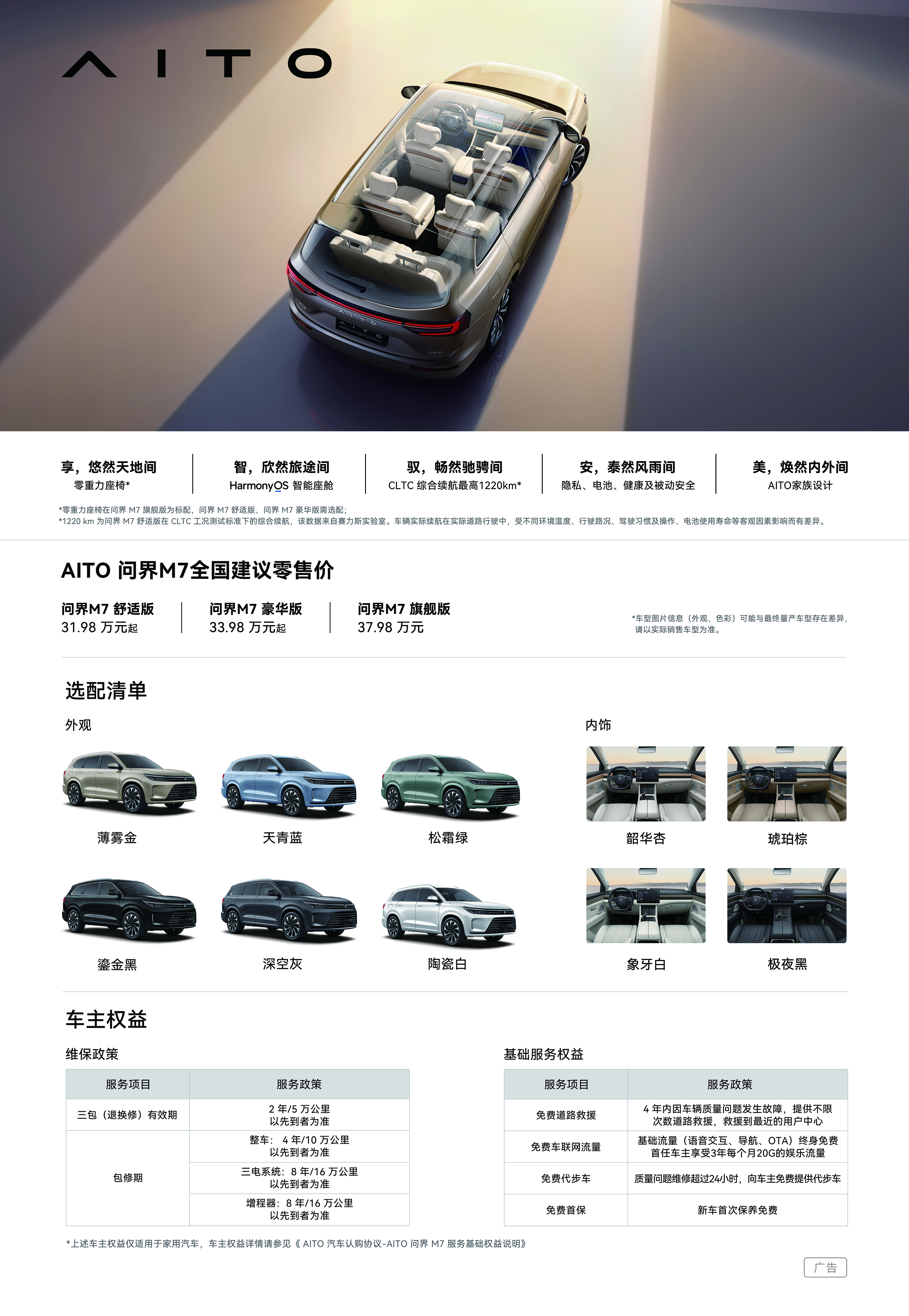 首批预定问界M7车主有专享好礼,还有HUAWEI Card车主权益与服务,尽享尊崇用车体验。