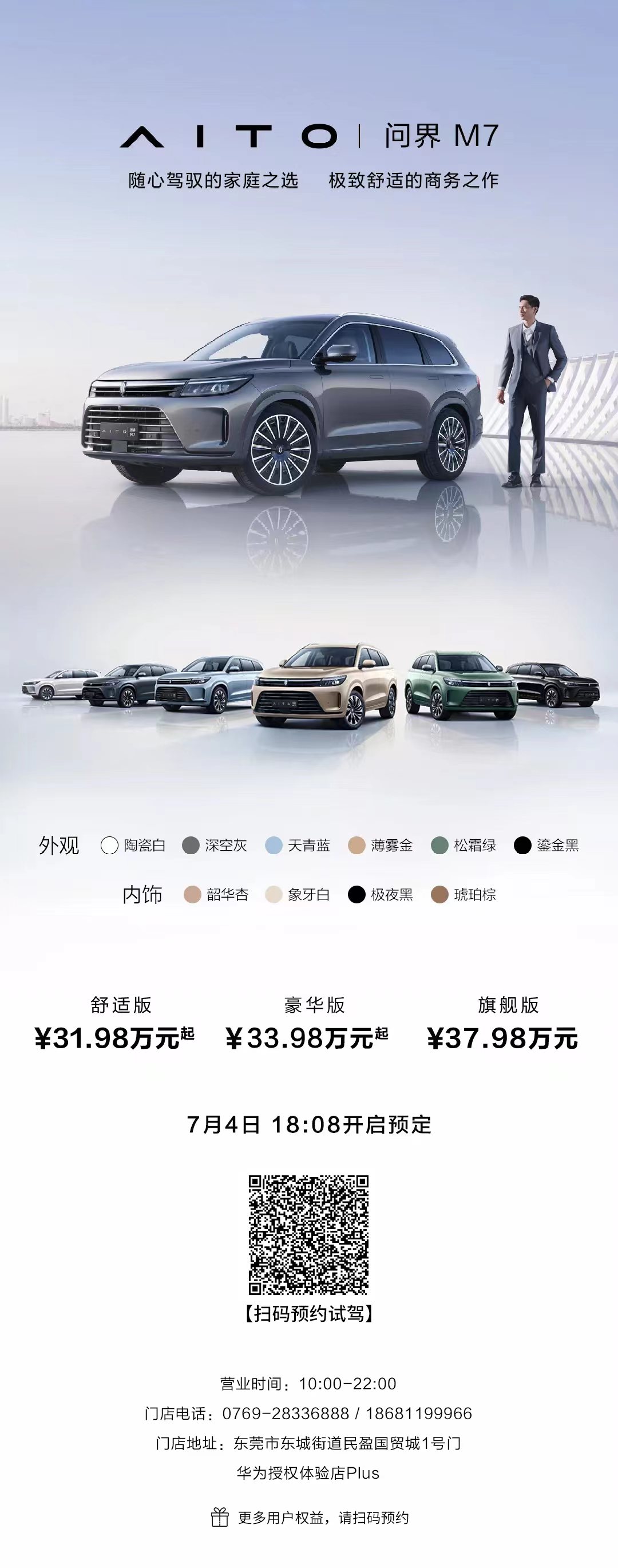 从今日起门店可接受预约预定,华为授权体验店(东莞民盈国贸城)一如既往为各大消费者提供优质的销售服务,欢迎大家到店体验咨询!预定享7重礼遇,期待你与AITO问界M7一起开启愉快旅程。
