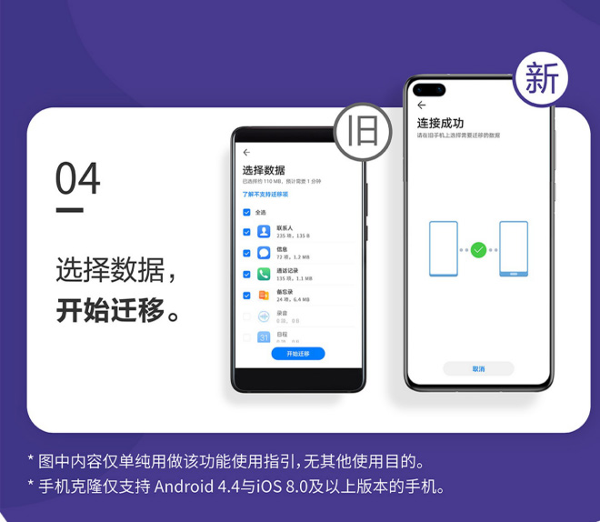 手机克隆仅支持 androids 4.4与ioses 8.0及以上版本的手机。