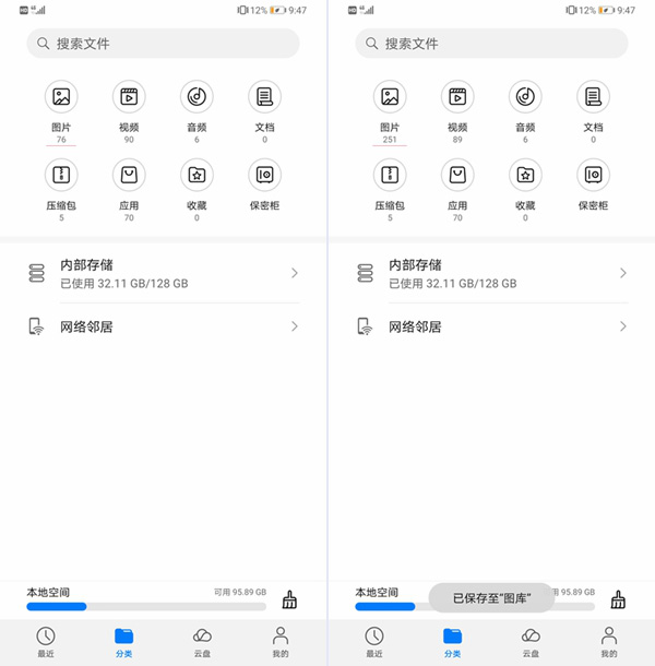STEP 2:这是文件管理的情况,左右两图相差了很多张,只开启了一个键,就把躲起来的照片找出来了。这些小图片本身是占用不了多少内存,但是如果长期以往,后果可想而知…