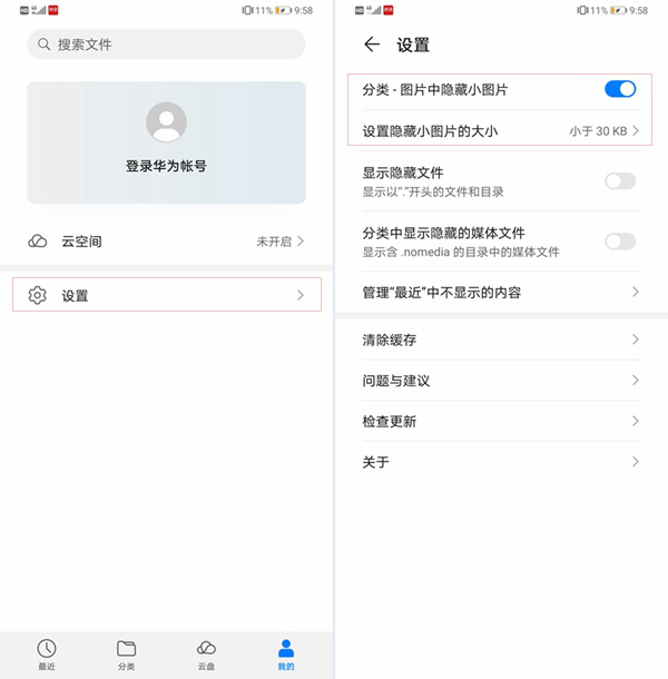 文件管理-我的-设置-关闭图片中隐藏小图片即可~