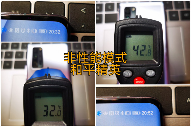 非性能模式下,运行和平精英约20分钟,手机表面最高温度从32.0℃升到42.8℃,20分钟耗电11%。