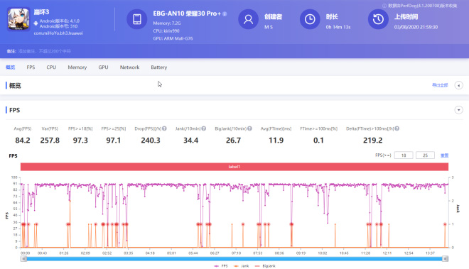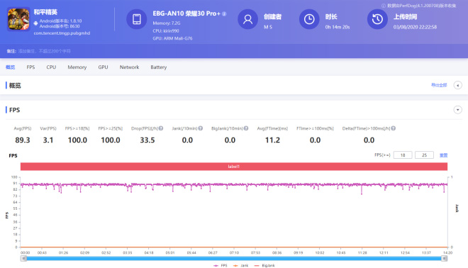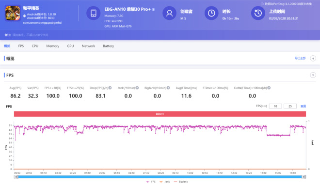 平均游戏帧率为86.2fps,在游戏记录中第14min20s左右开始发生了时长约1min20s的较大帧率波动,实时fps掉到70左右,根据后期针对手机CPU核心温度相关数据记录的核查,考虑是发热导致降帧,但是经过这1min20s左右的时间后,游戏帧率恢复到90fps上下,间接说明荣耀30 Pro+机器内部的散热能力还是不错的。