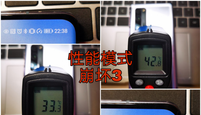 在性能模式下,运行崩坏3时长约17分钟,荣耀30 Pro+表面最高温度从33.3℃升到42.8℃,耗电约11%。与非性能模式比较,性能模式下手机表面出现的最高温度要高出2.6℃,游戏耗电则是略有增加。